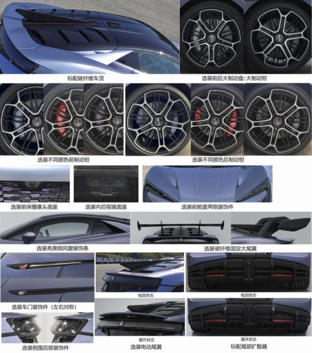 車尾部分,貫穿式尾燈組結合造型新穎的擾流板與碳纖維材質后引擎蓋極具辨識度。仰望U9還配備夸張的尾部擴散器組件。除此之外,新車還可以選裝碳纖維固定大尾翼以及選裝電動尾翼。新車的輪胎尺寸為275/35 R21和325/30 R21。車身尺寸方面,新車長寬高分別為4966/2029/1295(1338)mm,軸距為2900mm。動力方面,仰望U9搭載四電機驅動系統(tǒng),電機的最大功率為960kW。