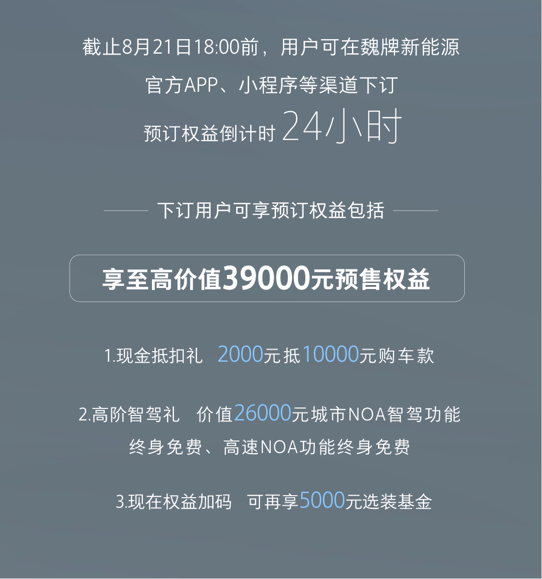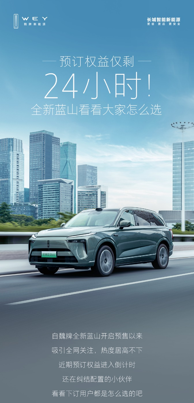 8月21日魏牌全新藍(lán)山上市,預(yù)訂權(quán)益正式進(jìn)入倒計(jì)時(shí),截至8月21日18:00前,可以在魏牌新能源官方APP、小程序等渠道下訂。下訂用戶可享至高價(jià)值39000元預(yù)售權(quán)益,含現(xiàn)金抵扣禮(2000元抵10000元購車款),高階智駕禮(價(jià)值26000元城市NOA智駕功能終身免費(fèi),高速NOA功能終身免費(fèi)),現(xiàn)在還有現(xiàn)時(shí)權(quán)益加碼,可再享5000元選裝基金。還在糾結(jié)配置的用戶,抓緊下訂吧。