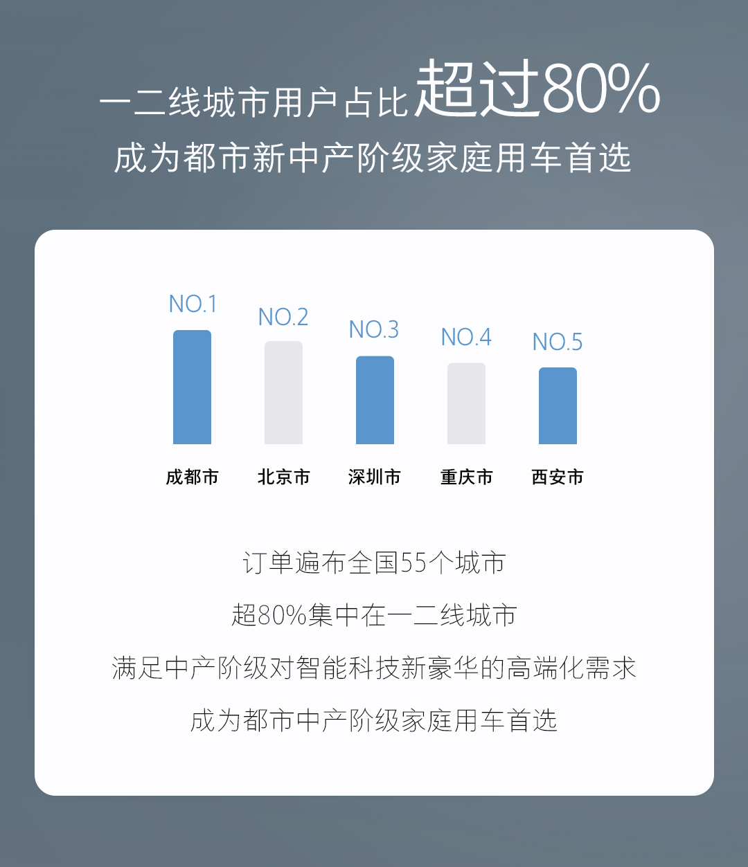 全新藍(lán)山的訂單已覆蓋全國55個(gè)城市,主要集中在成都、北京、深圳、重慶、西安等一二線城市,不僅彰顯了這些都市精英人群對(duì)高端智能出行方式的追求,更體現(xiàn)了其對(duì)智能駕駛和奢華配置的高要求。