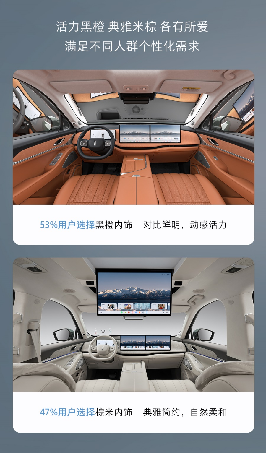 在內(nèi)飾方面,黑橙搭配占比53%,既保留了黑色的神秘感,又融入了橙色的活力元素,整體風(fēng)格不失優(yōu)雅大氣,又充滿動(dòng)感與生機(jī),彰顯出對(duì)比鮮明、溫暖陽光的空間氛圍;棕米內(nèi)飾則以47%的占比,為車艙營造一抹精致與高雅,高級(jí)質(zhì)感,一眼望去平和寧靜,營造出自然柔和的家庭氛圍,同樣符合更多用戶的審美需求。