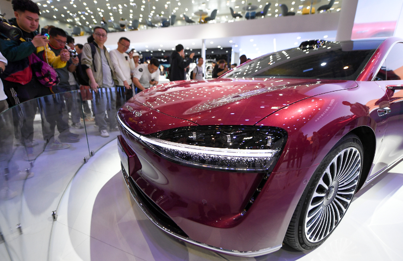 (資料圖)2024年4月25日,在北京中國(guó)國(guó)際展覽中心順義館舉行的2024北京車(chē)展上,參觀者觀看車(chē)展上發(fā)布的新款車(chē)型享界S9。新華社記者 鞠煥宗 攝