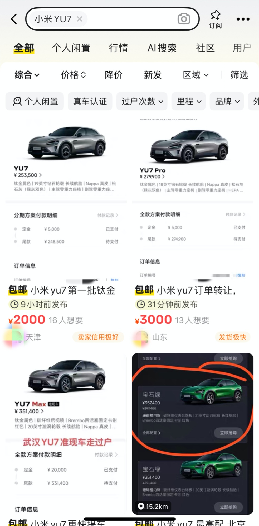 (二手平臺搜索YU7截圖)