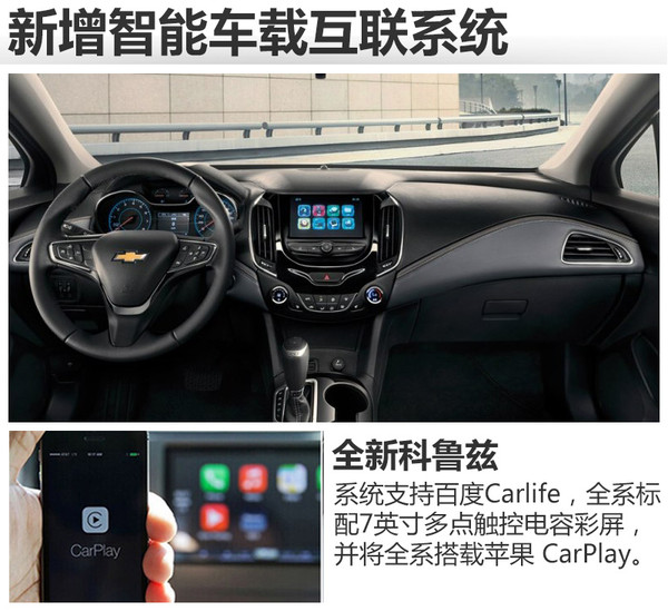 在配置方面,新車搭載了新一代MyLink智能車載互聯(lián)系統(tǒng),支持百度Carlife,全系標(biāo)配7英寸多點(diǎn)觸控電容彩屏,并將全系搭載蘋果 CarPlay。全新科魯茲還將新一代安吉星Onstar智能行車伙伴和4G LTE原裝集成車載Wi-Fi,可同時接入多個設(shè)備。