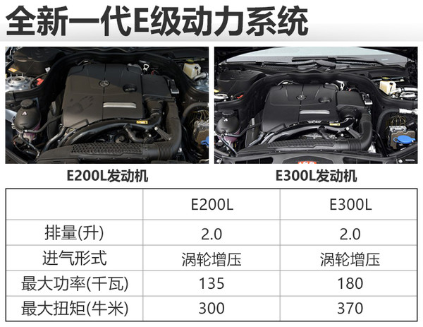 動力方面,新車將搭載兩款不同調(diào)校的2.0T渦輪增壓發(fā)動機(jī),其中E200L是沿用現(xiàn)款車型上的2.0T發(fā)動機(jī),最大功率135千瓦,最大扭計(jì)300牛米;E300L發(fā)動機(jī)則擁有更強(qiáng)的動力,最大功率180千瓦,最大扭矩達(dá)到370牛米。
