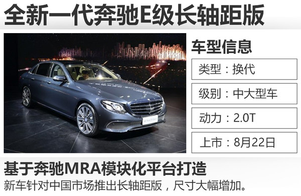 全新一代奔馳E級長軸距于上個月在北京奔馳亦莊工廠正式下線,新車針對中國市場的需求進(jìn)行了全面優(yōu)化,從外觀、內(nèi)飾到車身尺寸都有明顯提升。網(wǎng)通社從梅賽德斯-奔馳官方了解到,全新一代奔馳E級長軸距版將于8月22日在北京正式上市。新車采用不同調(diào)校的2.0T發(fā)動機(jī),并首次搭載9速自動變速箱。