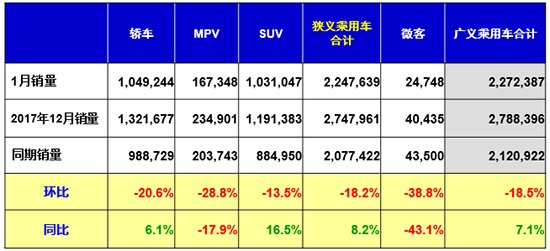 具體車型方面,1月SUV和轎車的銷量環(huán)比均出現(xiàn)下滑,同比則大幅增長,這也是1月份乘用車市場實(shí)現(xiàn)開門紅的主要?jiǎng)恿?;而MPV仍沒有復(fù)蘇的跡象,銷量同環(huán)比均出現(xiàn)下滑。