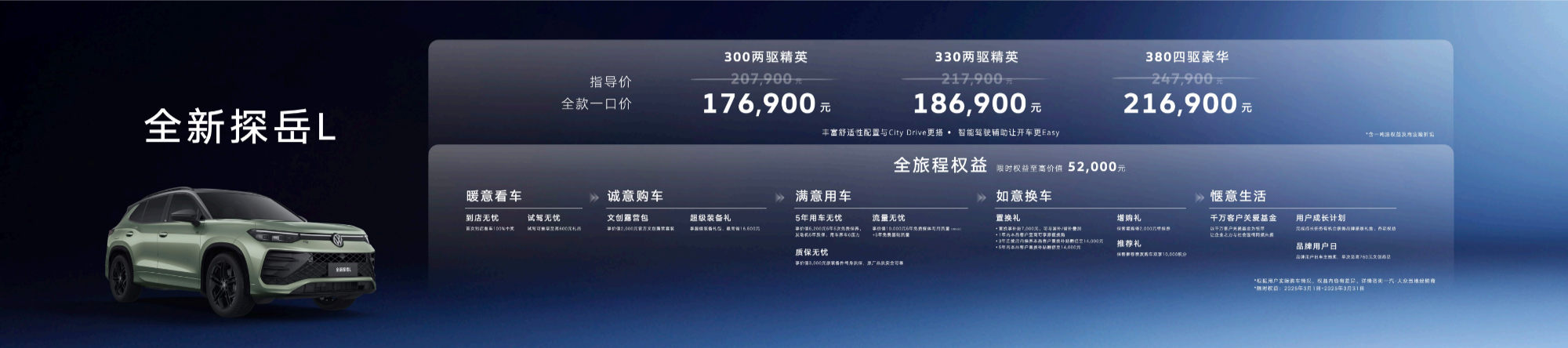 3月1日,一汽-大眾全新探岳L在五岳之首泰山震撼上市,新車共推出300TSI、330TSI、380TSI三種動(dòng)力配置共3種車型,官方指導(dǎo)價(jià)20.79萬元起,可選裝舒適性配置豐富的City包和駕駛輔助功能Easy包。現(xiàn)在購買全新探岳L,還將享受17.69萬元起的全款一口價(jià)。