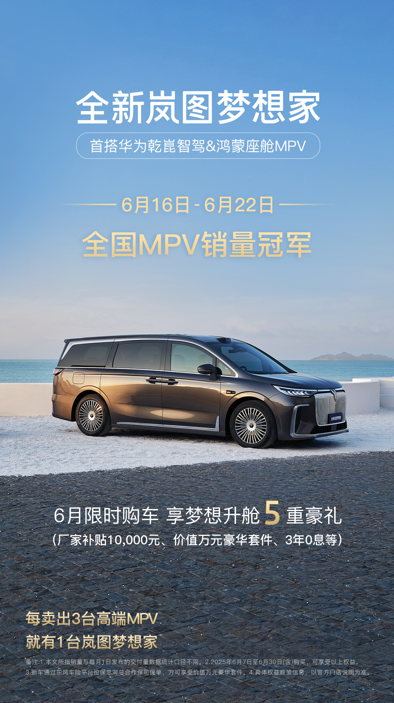 嵐圖夢想家6月官宣限時銷售政策,立省5.5萬元現(xiàn)金以及0元升級價值萬元豪華套件,在政策與產(chǎn)品力雙重疊加下,嵐圖夢想家成為當下MPV市場熱銷產(chǎn)品。