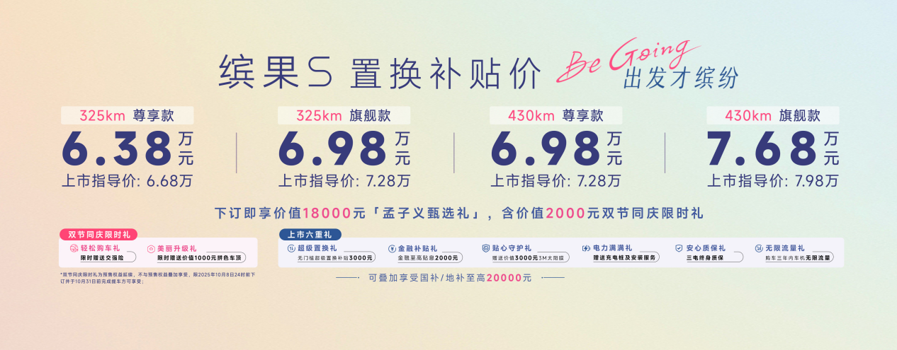 繽果S共推出325km尊享款、325km旗艦款、430km尊享款、430km旗艦款四款配置,上市指導(dǎo)價(jià)為6.68萬-7.98萬元,疊加置換政策可享置換補(bǔ)貼價(jià)6.38萬-7.68萬元,更可疊加享受至高20,000元的國家/地方購車補(bǔ)貼。