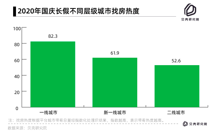 一個城市房產(chǎn)經(jīng)紀人帶客戶看房量——總帶看量,是衡量樓市熱度重要指標。10月1日-7日,一線城市找房熱度高于新一線、二線城市。從城市之間熱度比較看,四個一線城市總帶看熱度指數(shù)為82.3,明顯高于新一線城市的61.9和二線城市52.6。