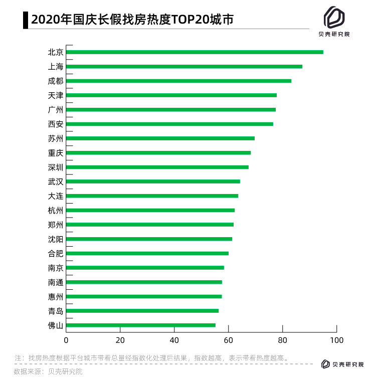 貝殼研究院對十一假期(10月1日-7日)平臺帶看數(shù)據(jù)統(tǒng)計顯示,北京“總帶看量”突破了5萬次,同比去年2.96萬次增幅明顯,位居城市排行榜第一名;上海與成都以4.2萬次和3.7萬次分列二三名。