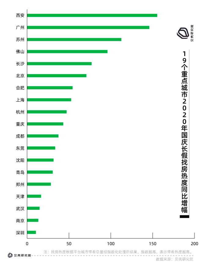 10月9日,貝殼找房發(fā)布了2020年城市“十一”找房熱度(二手房市場),全國多個城市找房活躍度同比去年均不同程度增長,其中西安、廣州、蘇州樓市相對火熱,經(jīng)紀人總帶看量同比出現(xiàn)了翻倍增長;而深圳、南京樓市趨冷,總帶看量增幅排在19個重點城市最后。