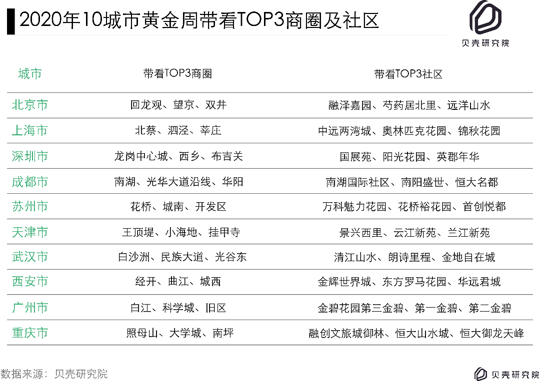 同樣,每個城市都有熱門商圈與人氣社區(qū)。此次,貝殼研究院特別梳理出2020年黃金周期間帶看量最高的十個城市,并找到其熱門商圈和社區(qū)。以城市帶看龍頭北京為例,回龍觀、望京、雙井商圈帶看熱度高,排名城市商圈TOP3;而融澤嘉園、芍藥居北里、遠洋山水三個社區(qū)帶看熱度在社區(qū)榜中關(guān)注度最高。