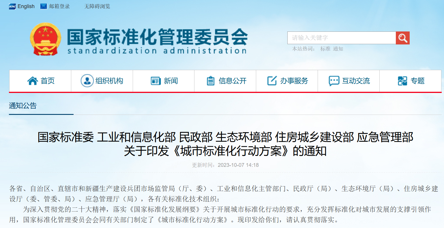 央廣網(wǎng)北京10月8日消息 據(jù)國家標(biāo)準化管理委員會網(wǎng)站消息,為落實《國家標(biāo)準化發(fā)展綱要》關(guān)于開展城市標(biāo)準化行動的要求,充分發(fā)揮標(biāo)準化對城市發(fā)展的支撐引領(lǐng)作用,近日,國家標(biāo)準化管理委員會會同工業(yè)和信息化部、民政部、生態(tài)環(huán)境部、住房城鄉(xiāng)建設(shè)部、應(yīng)急管理部制定了《城市標(biāo)準化行動方案》(以下簡稱《行動方案》)。