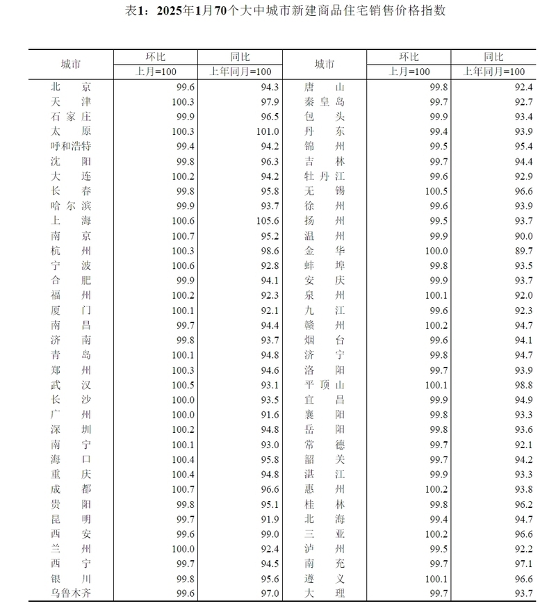 國(guó)家統(tǒng)計(jì)局城市司首席統(tǒng)計(jì)師王中華解讀稱:“2025年1月份,70個(gè)大中城市中,一線城市商品住宅銷售價(jià)格環(huán)比繼續(xù)上漲,二三線城市環(huán)比總體略降;一二三線城市同比降幅均持續(xù)收窄?!?/p>