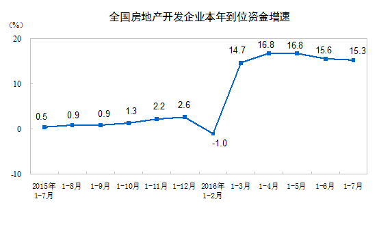 1-7月份,房地產(chǎn)開(kāi)發(fā)企業(yè)到位資金79881億元,同比增長(zhǎng)15.3%,增速比1-6月份回落0.3個(gè)百分點(diǎn)。其中,國(guó)內(nèi)貸款12605億元,增長(zhǎng)0.7%;利用外資93億元,下降49.8%;自籌資金27877億元,增長(zhǎng)0.4%;其他資金39307億元,增長(zhǎng)36.3%。在其他資金中,定金及預(yù)收款22321億元,增長(zhǎng)31.6%;個(gè)人按揭貸款13305億元,增長(zhǎng)54.6%。