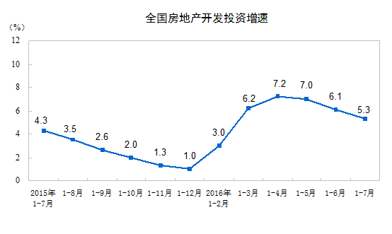 2016年1-7月份,全國(guó)房地產(chǎn)開(kāi)發(fā)投資55361億元,同比名義增長(zhǎng)5.3%,增速比1-6月份回落0.8個(gè)百分點(diǎn)。其中,住宅投資36981億元,增長(zhǎng)4.5%,增速回落1.1個(gè)百分點(diǎn)。住宅投資占房地產(chǎn)開(kāi)發(fā)投資的比重為66.8%。