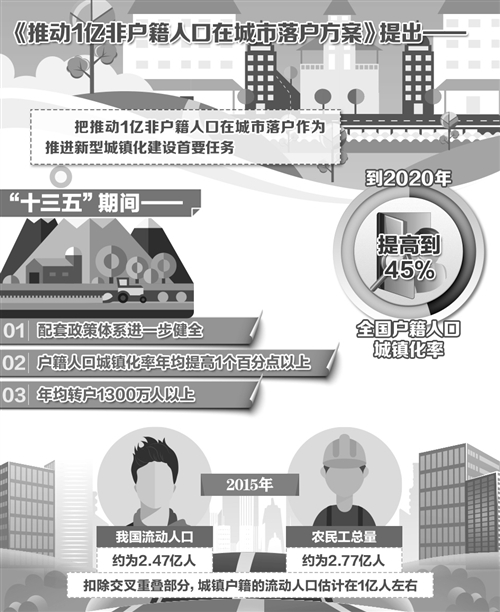 如何推動1億左右農(nóng)業(yè)轉(zhuǎn)移人口和其他常住人口等非戶籍人口在城市落戶,使有能力在城鎮(zhèn)穩(wěn)定就業(yè)和生活的農(nóng)業(yè)轉(zhuǎn)移人口舉家進(jìn)城落戶,是我國推進(jìn)新型城鎮(zhèn)化面臨的迫切任務(wù)。不久前,國務(wù)院辦公廳印發(fā)了《推動1億非戶籍人口在城市落戶方案》(以下簡稱《方案》)。