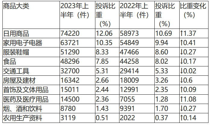 根據(jù)2023年上半年商品大類投訴數(shù)據(jù),日用商品類、家用電子電器類、服裝鞋帽類、食品類和交通工具類投訴量居前五位。與2022年上半年相比,日用商品類、醫(yī)藥及醫(yī)療用品類投訴比重上升明顯,房屋及建材類投訴比重有所下降。