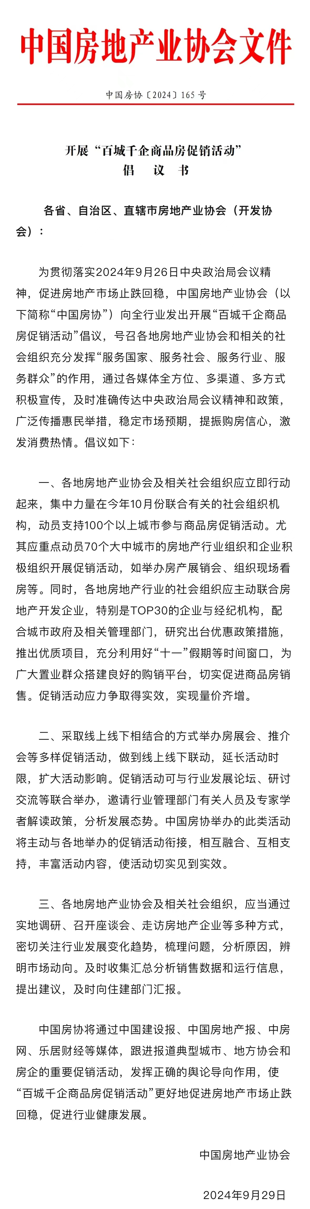 央廣網(wǎng)北京10月11日消息(記者安垚)據(jù)中國房地產(chǎn)業(yè)協(xié)會微信公眾號消息,為貫徹落實9月26日中央政治局會議精神,促進房地產(chǎn)市場止跌回穩(wěn),在住房和城鄉(xiāng)建設部的指導下,9月29日,中國房地產(chǎn)業(yè)協(xié)會(以下簡稱“中國房協(xié)”)發(fā)出開展“百城千企商品房促銷活動”倡議。