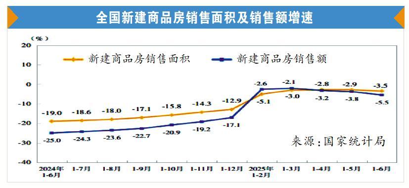 根據(jù)國家統(tǒng)計局發(fā)布的2025年上半年全國房地產市場基本情況,上半年,新建商品房銷售面積45851萬平方米,同比下降3.5%;其中住宅銷售面積下降3.7%。新建商品房銷售額44241億元,下降5.5%;其中住宅銷售額下降5.2%。6月末,商品房待售面積76948萬平方米,比5月末減少479萬平方米。其中,住宅待售面積減少443萬平方米。