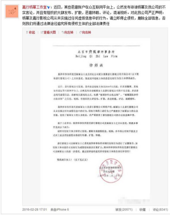 楊冪工作室發(fā)律師函