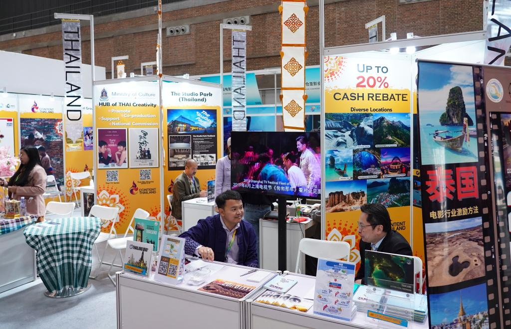 展會現(xiàn)場,裝點著傳統(tǒng)泰式紋樣掛幅的泰國主題展位格外顯眼,吸引不少參展人員駐足?!拔覀兪窃颇系碾娪肮?,想了解一下電影合作政策?!甭牭街袊娪肮镜暮献饕庀颍﹪娪稗k公室工作人員介紹起了泰國對電影行業(yè)的相關(guān)激勵政策,吸引外國制作團隊赴泰拍攝。