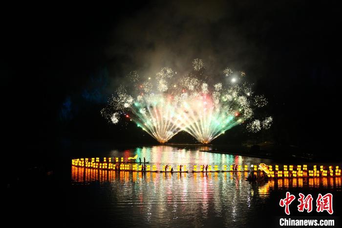 慶典演出現(xiàn)場(chǎng)人頭攢動(dòng),開場(chǎng)無人機(jī)表演在半空組合出紀(jì)念“印象劉三姐20年”的圖案,舞臺(tái)上擊鼓而舞的表演者渲染歡樂氛圍。以絢爛煙火為背景,漁翁表演者在江面組成蜿蜒長(zhǎng)龍,引得游客們紛紛贊嘆拍照。慶典演出環(huán)節(jié),桂林旅游學(xué)院和《印象·劉三姐》的演員們共同表演的舞蹈《漓江·春茶》、百人合唱《侗族大歌》、實(shí)景展演《龍騰印象》等精彩節(jié)目,帶來一場(chǎng)視覺盛宴。