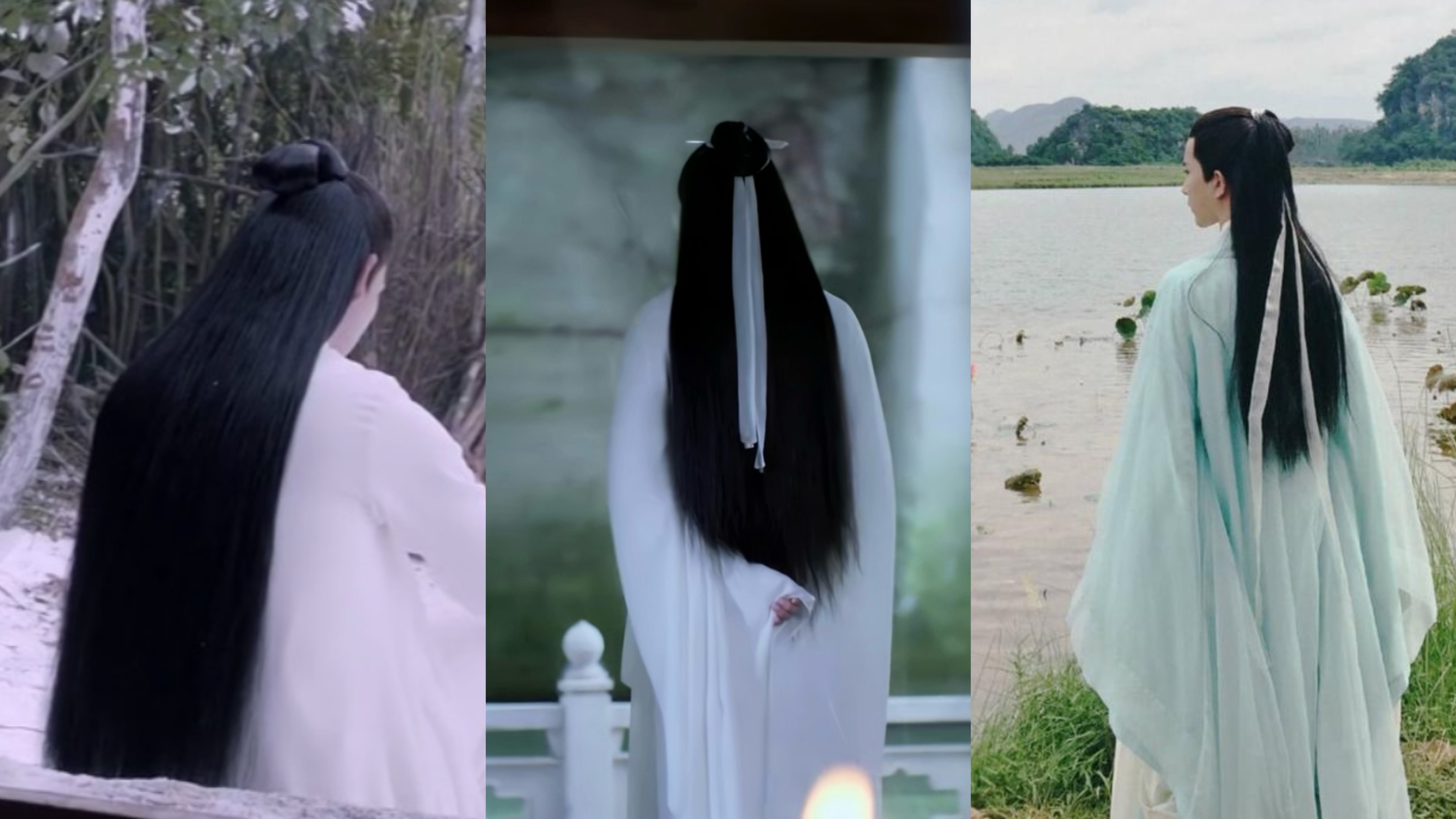 在古裝劇《烈火如歌》《天雷一部之春花秋月》《三生三世十里桃花》里,男演員的造型從背后看如出一轍。