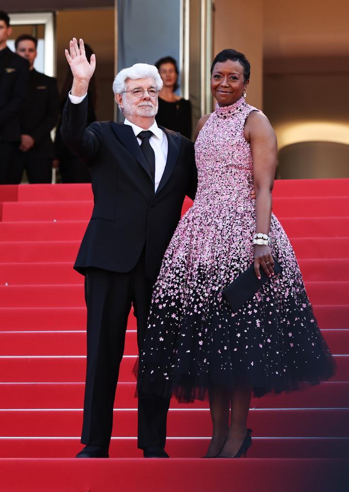 5月25日,在法國南部城市戛納舉行的第77屆戛納電影節(jié)上,美國導演、編劇、制片人喬治·盧卡斯(右)抵達閉幕式紅毯。新華社記者 高靜 攝