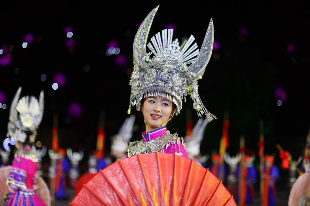 9月20日晚,演員在貴州省雷山縣大塘鎮(zhèn)表演苗族歌舞詩劇《仰歐?!贰P氯A社記者 楊文斌 攝