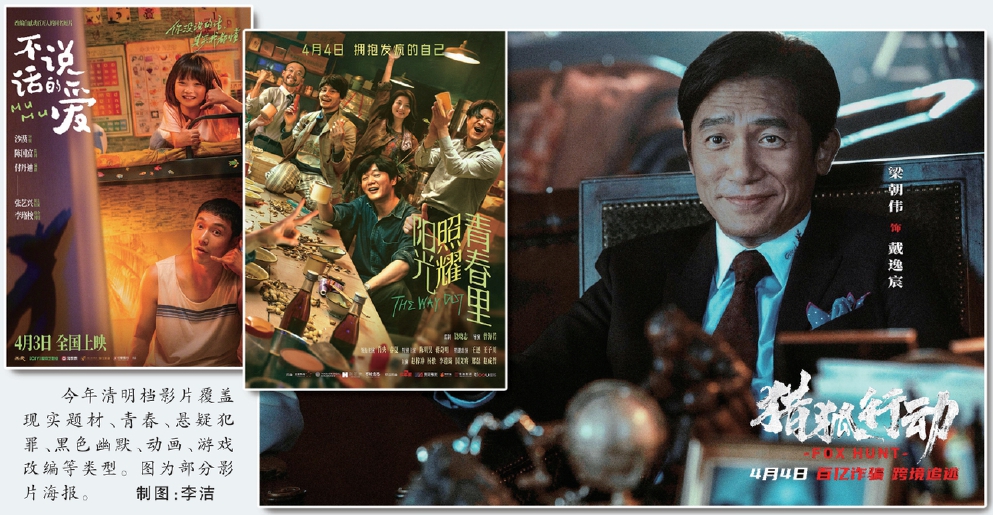 今年清明檔影片覆蓋現(xiàn)實(shí)題材、青春、懸疑犯罪、黑色幽默、動(dòng)畫、游戲改編等類型。圖為部分影片海報(bào)。 制圖:李潔 春暖花開,清明檔電影市場蓄勢待發(fā)。燈塔專業(yè)版顯示,截至昨晚,已有17部影片定檔在4月2日至4日。 相對(duì)春節(jié)檔、暑期檔、國慶檔等黃金強(qiáng)檔,清明檔是“小”的,3天時(shí)間可能尚不足以完全釋放市場能量。但這兩年,“小檔期”屢屢刷新市場認(rèn)知。2021年8.22億元、2024年8.42億元的票房成績都證明了,檔期之大小,并不絕對(duì)取決于強(qiáng)視效大片的濃度,只要能喚起真切的共情共鳴,觀眾就愿意走進(jìn)電影院消費(fèi)。與此同時(shí),上海市電影局聯(lián)合淘票票、貓眼推出了新一輪總價(jià)值4500萬元“樂影上?!彪娪跋M(fèi)券,政企聯(lián)手助力消費(fèi)。 從目前的檔期片單來看,影片供給充足,覆蓋現(xiàn)實(shí)題材、青春、懸疑犯罪、黑色幽默、動(dòng)畫、游戲改編等多元類型、不同體量;主創(chuàng)陣容里不乏梁朝偉、段奕宏、趙麗穎、張藝興、肖央等頗有票房號(hào)召力的演員。今年的清明檔能否再次激發(fā)觀眾的觀影熱情,我們期待好故事給出答案。 人文關(guān)懷:讓電影催動(dòng)現(xiàn)實(shí)的能量 如果檔期有性格屬性,清明檔大約是最具人文關(guān)懷的之一。踏青出游、慎終追遠(yuǎn)的假期里,人們似乎更愿意聆聽那些有關(guān)生命真諦的事。今年,多部影片關(guān)注特殊群體,試圖引發(fā)觀眾對(duì)人性與社會(huì)的思考,展現(xiàn)電影對(duì)社會(huì)議題的深度探索與藝術(shù)表達(dá)的創(chuàng)新嘗試。 截至30日中午,影片《不說話的愛》預(yù)售票房率先突破千萬元,領(lǐng)跑檔期。該片由青年導(dǎo)演沙漠執(zhí)導(dǎo),講述了聾人父親小馬與聽人女兒木木在無聲世界里雙向守護(hù)的故事。難得的是,影片試圖在片場內(nèi)外都構(gòu)建起跨越有聲與無聲世界的對(duì)話橋梁。故事里,導(dǎo)演的表達(dá)不只停留在親情敘事層面。小馬為給孩子更好的生活,不幸被騙入歧途,陷入道德困境,這樣的犯罪情節(jié)既有商業(yè)片的框架,也從另一個(gè)維度探究聽障群體的生活處境,實(shí)現(xiàn)了社會(huì)性?,F(xiàn)實(shí)中,影片邀請近30位聾人演員參演,主演張藝興也潛心學(xué)習(xí)手語、全程零臺(tái)詞演繹。從昨天的限時(shí)點(diǎn)映口碑來看,新片情感細(xì)膩,催淚但不喪。 《向陽·花》尚未開啟預(yù)售,但影片自官宣以來始終熱度居高。馮小剛導(dǎo)演、趙麗穎領(lǐng)銜主演的陣容固然是個(gè)中緣由,更關(guān)鍵的恐怕還是小眾題材。電影將鏡頭對(duì)準(zhǔn)女性刑滿釋放人員,追蹤她們在回歸社會(huì)過程中面臨的道德審判、生存壓力、情感掙扎。此前,導(dǎo)演曾表示,影片著力通過這些角色從“社會(huì)邊緣人”到“自我救贖者”的蛻變,展現(xiàn)女性在絕境中迸發(fā)的生命力。 《特別的你》作為中國首部孤獨(dú)癥群體紀(jì)錄電影,將在4月2日“世界孤獨(dú)癥日”公映。影片聚焦三個(gè)孤獨(dú)癥孩子,通過真實(shí)影像照見孤獨(dú)癥人士及其家庭的日常:12歲的程瑞有繪畫天賦,但溝通能力欠缺,情緒不定;15歲的可可已經(jīng)擁有了成年人的外形體格,但仍缺乏足夠的生活自理能力;19歲的王浚力有著相對(duì)健全的語言溝通和獨(dú)立生活能力,但最讓母親掛懷的還是讓他找份工作,有機(jī)會(huì)自食其力。影片在上海的超前首映式上,導(dǎo)演翁羽說,全國有1400萬孤獨(dú)癥患者,這背后就是1400萬個(gè)終身需要陪護(hù)的人,他希望通過《特別的你》讓更多人了解孤獨(dú)癥群體。 《陽光照耀青春里》由曾海若導(dǎo)演,以黑色幽默探討精神康復(fù)院里的身份困境。肖央飾演的游戲開發(fā)程序員,與春夏、陳明昊、蔣奇明等出演的特殊群體群像,如何在啼笑皆非的故事里碰撞出普通人內(nèi)心的秘密,將成為影片一大看點(diǎn)。在監(jiān)制饒曉志看來,每個(gè)靈魂都渴望被看見,影片希望用尊重和理解的視角展現(xiàn)特殊群體,“希望呈現(xiàn)的不是苦難,而是‘青春里’這些人本真的那一面”。 這些影片如同一面面鏡子,映照出容易被忽視的角落。就像翁羽說的,“電影創(chuàng)作者關(guān)注特殊群體,與其說是‘拯救’,不如說是‘被拯救’,是每一個(gè)加倍熱愛生活的他們,讓我看到了自己拍電影的意義”,電影的價(jià)值不僅在于呈現(xiàn),也在于以藝術(shù)的力量重構(gòu)人們對(duì)“他者”的理解,激發(fā)社會(huì)的關(guān)注和行動(dòng)。 細(xì)分賽道:等待黑馬破局 如果說關(guān)注普遍人性、具有人文關(guān)懷的電影能網(wǎng)羅不同年齡、不同喜好的觀眾,那么在數(shù)字文娛消費(fèi)重塑電影市場的今天,細(xì)分賽道越來越值得關(guān)注。 海外追逃犯罪大片《獵狐行動(dòng)》由梁朝偉與段奕宏領(lǐng)銜主演,可謂傳統(tǒng)警匪片愛好者的硬核福利。片中,潛逃七年的上海百億金融詐騙案主犯戴逸宸現(xiàn)身巴黎,聞?dòng)嵍鴦?dòng)的經(jīng)偵警探葉鈞率“獵狐小隊(duì)”展開跨國追緝,起底174億百姓血汗錢一夜蒸發(fā)背后的驚天內(nèi)幕。影片取材自中國公安機(jī)關(guān)跨國追逃真實(shí)案例,主創(chuàng)曾耗時(shí)三年走訪北京、上海以及巴黎、諾曼底等地實(sh
