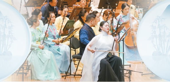 演出由知名華人指揮家湯沐海執(zhí)棒,來自上海民族樂團的70余位演奏家一同奏響華章?!昂I仙駱贰狈忠魳窌婧蜕虾R魳窂d駐場版,前者偏向西方當代交響音樂會的制式,后者則融入多媒體光影,更傾向于沉浸式音樂現(xiàn)場。因而,曲目會根據(jù)現(xiàn)場環(huán)境和觀眾特征做適當調(diào)整。國外演出時,會增加二胡與樂隊合奏的《臥虎藏龍》(見上圖)——這是東西方觀眾都熟悉,甚至會在眼前浮現(xiàn)出竹林搖曳畫面的曲目。音樂會版在編曲上的處理會在尾聲處以漸強手法處理中西樂器的合奏共鳴,把情感推向高潮。琵琶、京胡與樂隊合奏的《楚漢》中,俞冰的琵琶獨奏氣勢不凡,凸顯出西楚霸王的威武。嗩吶與樂隊合奏《鳳舞》時,胡晨韻不僅能吹出一個超乎常人想象的長音,還能與笛子手等一起營造一群鳥兒的生動“對話”,時而平和時而激動,惹得觀眾忍俊不禁。而改編自膾炙人口的《野蜂飛舞》的民樂重奏《蜂飛》則賦予俄羅斯作曲家里姆斯基-科薩科夫的經(jīng)典名曲“中華風韻”——眼見著民族樂器在王音睿、趙臻、丁龍等掌控的打擊樂、笙和二胡的樂音中展現(xiàn)出妙趣橫生的“畫面”。而開場,金鍇與趙韻夢領銜的竹笛與樂隊合奏《湖光》則凸顯出江南文化的音樂聲色。