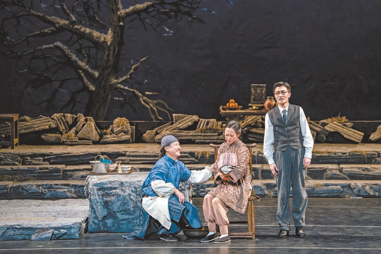 舞臺(tái)地面也由過去的雪地變成了石板地。石板形象參考了“圓明園”的石頭形制,隱喻著“石頭很頑強(qiáng),雖然被摧殘過,但是它依然在,并且會(huì)一直存在下去”。臺(tái)前幾盆老舍先生最愛的菊花,也依舊開得繁盛。