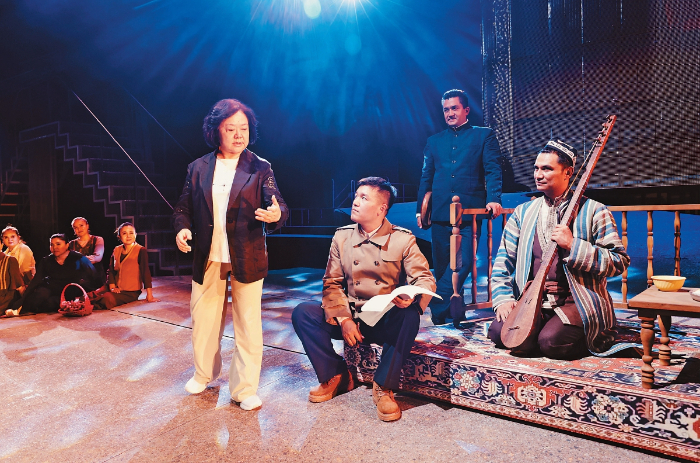 無論是《漢口茶港》中茶商抗日的英雄氣概,《奧涅金》中對真摯愛情的永恒追求,還是《原野》中對人性復(fù)雜性的深刻揭示,她的作品總能在具體故事中提煉出超越時代的價值。而對于《木卡姆戀歌——萬桐書》,她更看重作品在鑄牢中華民族共同體意識方面的現(xiàn)實意義,“無論從當(dāng)年萬桐書先生到新疆搶救木卡姆,還是我們劇組本身,我的執(zhí)行導(dǎo)演是維吾爾族,演員隊伍也是多民族的,整個劇組就是一個大家庭?!?/p>
