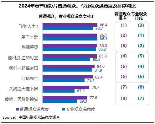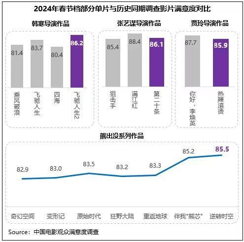 中國電影觀眾滿意度調(diào)查?2024年春節(jié)檔調(diào)查結(jié)果顯示,春節(jié)檔觀眾滿意度得分85.9分,為2015年以來調(diào)查9個春節(jié)檔的第二名,同時居歷史調(diào)查各檔期滿意度第四位。檔期調(diào)查的8部影片中有4部超85分(《飛馳人生2》86.2分、《第二十條》86.1分、《熱辣滾燙》85.9分、《熊出沒·逆轉(zhuǎn)時空》85.5分),數(shù)量和2023年同期持平,均為歷年春節(jié)檔之最。檔期多元化佳作頻出,以優(yōu)質(zhì)創(chuàng)作獲得觀眾高滿意度評價,再度掀起春節(jié)全民觀影熱潮。