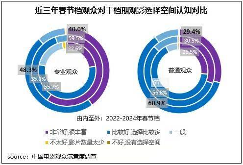 2024年春節(jié)檔優(yōu)質(zhì)的影片內(nèi)容矩陣有效拉動觀影及討論氛圍,檔期內(nèi)有合計90.3%的普通觀眾認(rèn)為檔期觀影選擇空間“非常好”或“比較好”,這一占比較去年同期高出2.9個百分點(diǎn);專業(yè)觀眾這一占比為88.3%,略低于去年同期。