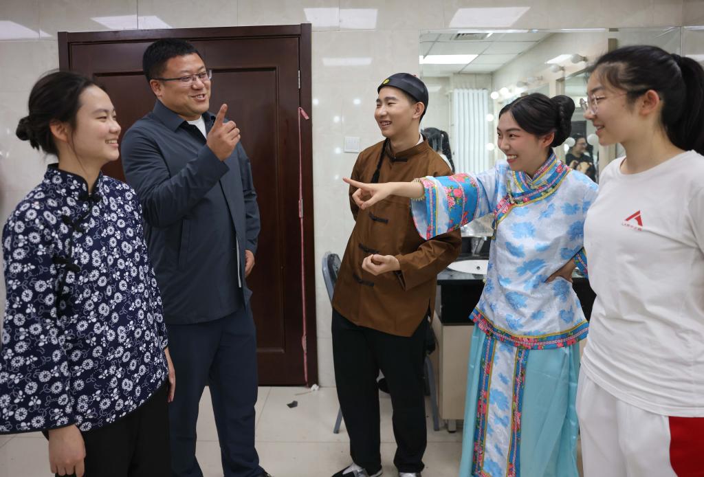 5月11日,中國(guó)人民大學(xué)附屬中學(xué)分校副校長(zhǎng)王堯(左二)與學(xué)生交流戲劇舞臺(tái)動(dòng)作。新華社記者 殷剛 攝