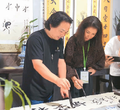 巴西泰坦尼制作有限公司制作人莉莉安娜·羅查·卡瓦薩(右)在廣東珠海北山社區(qū)體驗書法。論壇主辦方供圖