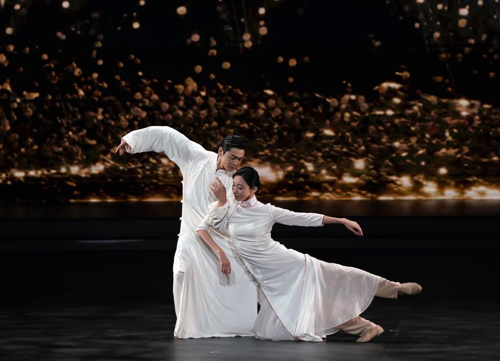 6月15日,第26屆上海國際電影節(jié)開幕影片、舞劇電影《永不消逝的電波》的演員朱潔靜(右)、王佳俊在金爵盛典上表演。新華社記者劉穎 攝
