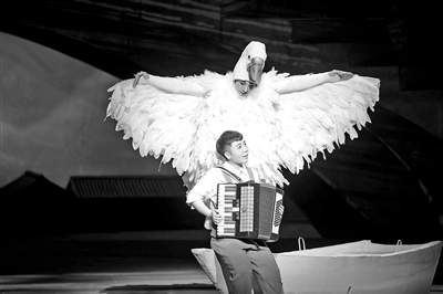 最具情趣的莫過于由北京京劇院武丑演員曹陽陽帶領(lǐng)一眾北戲?qū)W生演出的大鵝,身披潔白羽毛憨態(tài)可掬。這也是曹陽陽從藝以來第一次在舞臺(tái)上以動(dòng)物的形態(tài)進(jìn)行表演。這個(gè)與主角林大林互動(dòng)最多的角色,既要化身林大林渴望的父愛,又是他孤單時(shí)的玩伴。在模仿大鵝走路的過程中,曹陽陽便用上了京劇武丑的技巧。其中一場水中救人的段落,他甚至還要從兩米多高的橋上展開翅膀飛身下去,對京劇下高、空翻技巧有了全新的展示。