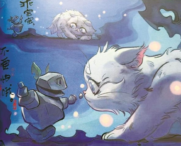 繪本故事中,石磯娘娘住的山里闖進(jìn)了一只小貓咪,魔鏡告訴她高大的樣子可能會(huì)嚇到貓咪,于是她就變成小石頭人的樣子與貓咪成了好朋友(見(jiàn)上圖),她還給小貓咪起名叫“虎子”。有一天她和貓咪玩耍的時(shí)候碰見(jiàn)了一只野獸,為了保護(hù)小貓咪,她恢復(fù)了高大的樣貌嚇跑了野獸,也嚇跑了“虎子”。于是石磯娘娘又變成了孤身一人,直到有天小貓回來(lái),告訴她自己找到了媽媽?zhuān)娴囊x開(kāi)山里了,石磯娘娘則含淚與小貓做了正式的告別。暖心的故事看哭了很多觀眾。