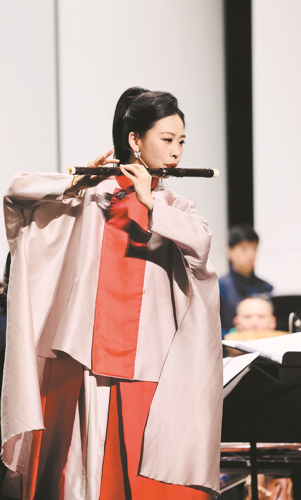 29歲的笛簫演奏家王澤上演李博禪作曲的《云水三章》。這首誕生于2023年的新作分為“向天邊的云”“向水中的葉”“向遠方的人”三部分,展現(xiàn)了曲笛、梆笛、新笛和簫的不同技巧和音樂特色,表達不同的人生意境。28歲的高雅演奏的是郭文景作曲的《愁空山》,這部作品被譽為竹笛界“最具演奏難度的曲目之一”。高雅迎難而上,不僅傳達了作品雄渾、厚重的精神內核,又呈現(xiàn)出細膩感和層次感。