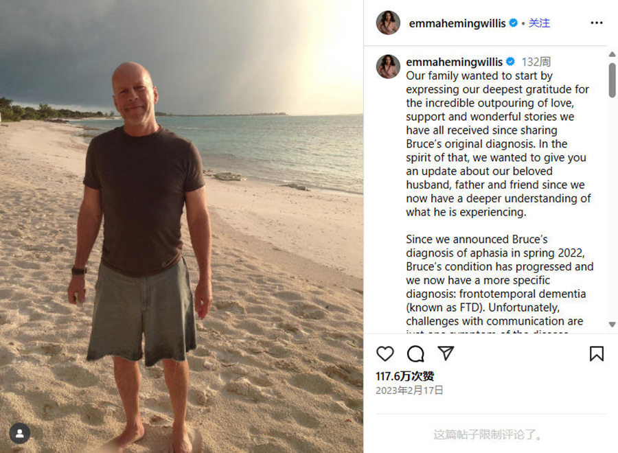 2022年,布魯斯·威利斯的家人發(fā)布聯(lián)合聲明,宣布他將退出演藝事業(yè)。因?yàn)樗辉\斷患上失語癥,這影響了他的認(rèn)知能力和溝通能力。一年后,家人再次發(fā)文透露,他的病情進(jìn)一步發(fā)展,且有了更具體的診斷結(jié)果:額顳葉癡呆(FTD)。