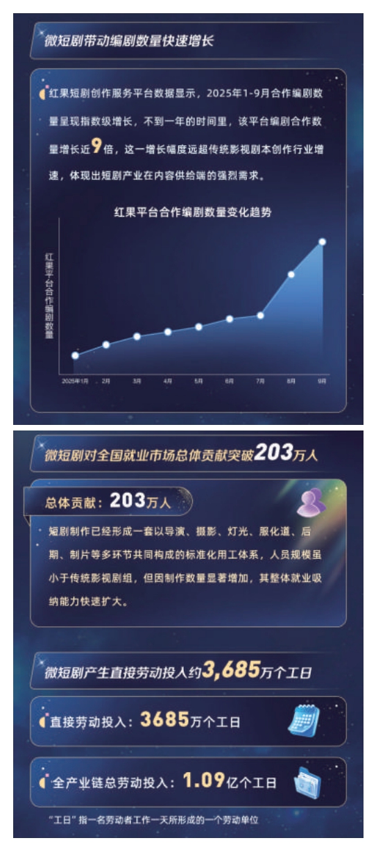 “微短劇通過(guò)龐大的規(guī)模效應(yīng)擴(kuò)大了整體就業(yè)容量,精準(zhǔn)激活了傳統(tǒng)影視行業(yè)中因項(xiàng)目斷檔而時(shí)?!e置’的人力資源,讓編劇、攝影師、場(chǎng)務(wù)、服化道等從業(yè)者實(shí)現(xiàn)了持續(xù)‘有活干、有錢(qián)賺’的良性循環(huán)?!睒I(yè)內(nèi)人士表示,“微短劇行業(yè)已成為吸納青年群體、靈活就業(yè)人員及傳統(tǒng)影視溢出人才的重要蓄水池,不僅為專(zhuān)業(yè)人才提供了舞臺(tái),也為大量勞動(dòng)者提供了實(shí)實(shí)在在的收入來(lái)源和職業(yè)發(fā)展路徑。”