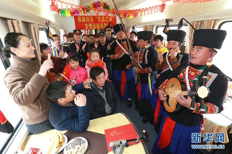 2月1日,彝族藝術(shù)家在K165次列車上為旅客表演。當(dāng)日,在西安鐵路局西安至昆明的K165次列車上,四川美姑縣原生態(tài)畢摩樂(lè)隊(duì)與西安客運(yùn)段職工民樂(lè)小分隊(duì)聯(lián)合舉辦“英雄列車民族之聲親情溫暖回家路”音樂(lè)會(huì),畢摩樂(lè)隊(duì)用口弦、哈門、木葉、瑪布等彝族民間樂(lè)器演奏的音樂(lè)為返鄉(xiāng)過(guò)年的旅客提前送上新年祝福。民間藝術(shù)家和列車乘務(wù)員還為旅客們送上“福”字、春聯(lián)。新華社發(fā)