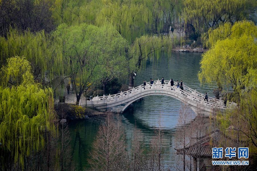 3月17日,山東濟南大明湖畔楊柳吐翠,杏花飄香,市民踏春游湖盡享明媚春光。 新華社記者 郭緒雷 攝