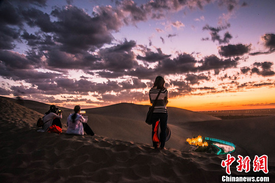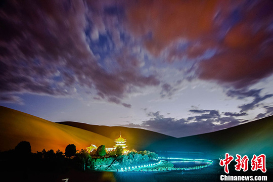 7月中旬,國際旅游名城甘肅敦煌進入旅游旺季,每天成千上萬的海內外游客來到當地著名鳴沙山月牙泉景區(qū)觀光游覽,觀賞大漠風光,感受敦煌文化,體驗民俗風情。傍晚時分,西邊的天空被晚霞染紅,美麗的月牙泉被寶藍色的燈光點綴著呈現(xiàn)出美輪美奐的闌珊夜色,大批游人沉浸于如夢如幻的迷人夜色里流連忘返。
