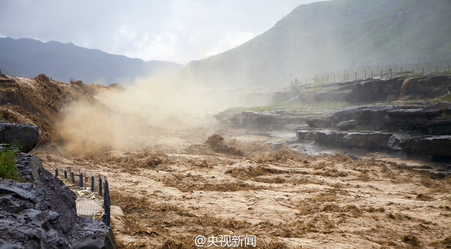 受上游強降雨和水庫放水影響,最近幾天,黃河壺口瀑布迎來伏汛,最大水流量達到每秒2600立方米左右,濁流滾滾奔騰而下,氣勢磅礴?。ㄑ胍曈浾呃钪?文豪)