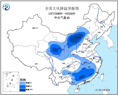 據(jù)中央氣象臺(tái)網(wǎng)站消息,2月7日06時(shí)繼續(xù)發(fā)布寒潮藍(lán)色預(yù)警:預(yù)計(jì),受寒潮影響,7日至9日,我國(guó)中東部大部地區(qū)自北向南將先后出現(xiàn)大范圍大風(fēng)降溫和雨雪天氣,平均氣溫將普遍下降4℃以上,其中,青海東部、陜西北部、內(nèi)蒙古中部、山西北部、貴州東南部、湖南中南部、江西中南部、福建西部、廣西北部和廣東北部等地氣溫將下降8℃以上,局地超過(guò)10℃。長(zhǎng)江以北地區(qū)并伴有4~6級(jí)偏北風(fēng),東部和南部海區(qū)風(fēng)力有7~9級(jí)。